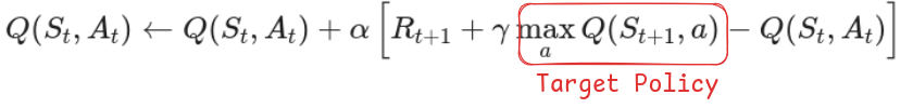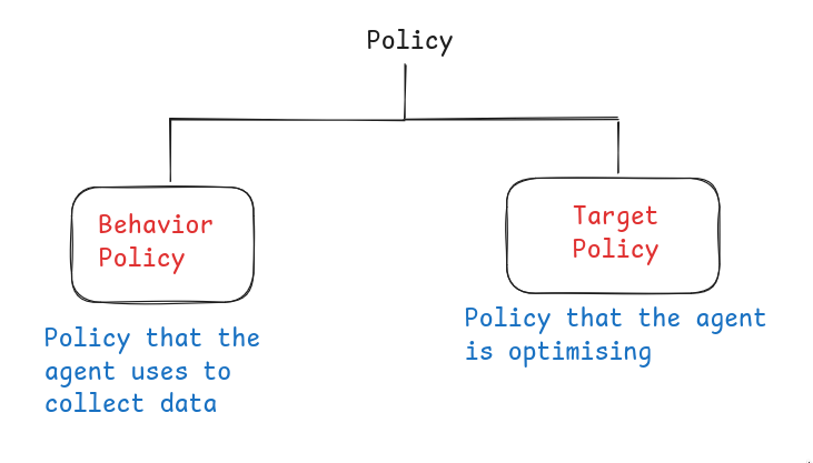 There are two types of Policy, behavior policy and target policy. Behavior policy is the one that the agent is using to collect data, and target policy is the one that agent updates.
