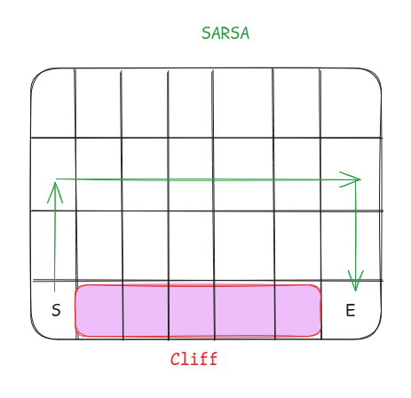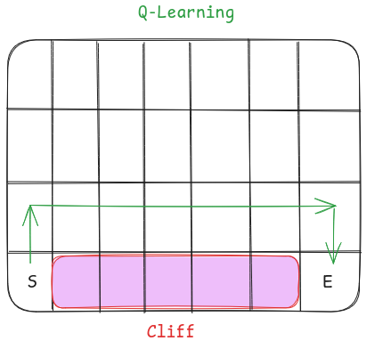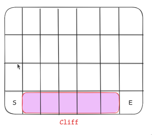 Let’s understand it through the cliff walking example. An agent is at the start of the grid denoted by S. Agent has to go to the end marked by E but the agent cannot fall into the cliff.