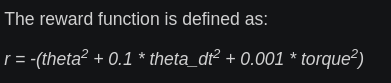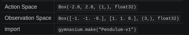 Here our action space is going to have a dimension of 1 as it is just the torque applied to free end of the pendulum. Observation space is x,y,w which denotes the Cartesian coordinates and angular velocity of the free end, this is of dimension 3.